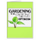 The design has a computerised drawing of a seedling in the corner, and writing in various fonts which reads 'Gardening is an exercise in optimism'.