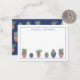 This personalised stationery note card features a painted design of succulents and cacti in colourful pots. It has a clean white writing area with a blue border and a patterned back. The style is simple, chic, and perfect for a gardener or as a thank you note.
