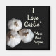 A humourous culinary kitchen magnet with 3 white Garlic bulbs tastefully arranged and highlighted against a black background and a fun warning that "I Love Garlic more than People". The text may be personalised. This magnet makes a fun gift for a gourmet chef, Your favourite cook or Italian cuisine lover. This is original food photography by JLW_PHOTOGRAPHY.