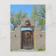 A school bell crowns the doorway of an adobe wall in Santa Fe, New Mexico. Rustic boards create a welcoming door, graced by a floral wreath.