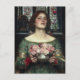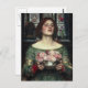 Young woman in front of stained glass window holding a silver bowl full of pink roses. Camelot inspired fine art.