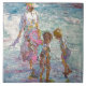 A mother, sunhat gently tilted, guides two children through a shimmering tidepool of colour and light. They bend in curiosity, searching for sea-treasures beneath the ripples — shells, stones, maybe memories. The scene captures the innocence of childhood and the quiet strength of maternal presence. Waves glisten in hues of turquoise and lavender, while soft shadows dance in sun-washed sand. There's movement, but also stillness — like a moment suspended in warm salt air.