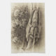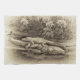 A interesting black and white vintage rendering of a small American alligator rest atop a larger sleeping American alligator.