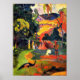 Gauguin Landscape with Peacocks poster. Oil painting on canvas from 1892. Paul Gauguin is most recognised for his famous paintings of Tahiti. Matamoe, Or Landscape with Peacocks is one of his most beloved works. Peacocks walk in the foreground as a Tahitian man chops wood by a fire. A hut stands in the background with two women talking below palm trees as the sunset turns the landscape orange, purple, red and yellow. A great gift for fans of Paul Gauguin, peacocks, Tahiti, post-impressionism, and tropical art.