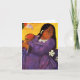 Paul Gauguin Woman with a Mango note card. Oil painting on canvas from 1892. Gauguin is renowned for his famous paintings of Tahiti and its people. Woman with a Mango is one of his most expressive works. The painting features a girl with dark black hair in a purple dress smiling slightly while holding a red mango in her right hand before a yellow wall. A small caption reads “Vahine no te Vi.” A great gift for fans of Gauguin, Cloisonnism, Tahiti, and tropical painting.