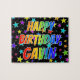 This vibrant and lively birthday-themed jigsaw puzzle design has the message "HAPPY BIRTHDAY, GAVIN" with the characters having a colourful rainbow spectrum inspired gradient pattern, along with an exciting star field background pattern. A colourful puzzle like this might be used to send a birthday greeting message to somebody named Gavin. [~Z0000468]