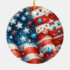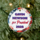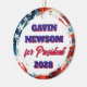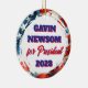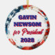 Gavin Newsom for President in 2028. Red, white and blue patriotic political Christmas ornament with a cartoon caricature of Gavin.