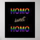 Sweet and funny poster, with decorative text "HOMO sweet HOMO", one word per line. First and last shows bold capital letters filled with the gay symbol, the rainbow flag. The centered "sweet" is slightly angled and can be color adjusted.