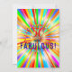 Retro "50 and Fabulous!" or any age customisable bright and cheerfully festive fiftieth birthday invitation. With a bold rainbow starburst logo on the front and back and purple glitter on a mauve background on the front.
