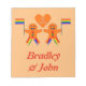 This awesome notepad features a digital art image of a cute gingerbread Gay Male couple. The gingerbread men have rainbow coloured fringes on their legs that matches the colours of the pride flag. They have green and red buttons and are each waving a rainbow coloured flag. Both have a big smile. There is a gingerbread heart above the couple showing their love for each other.