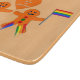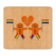 This awesome cutting board features a digital art image of a cute gingerbread Gay Male couple. The gingerbread men have rainbow coloured fringes on their legs that matches the colours of the pride flag. They have green and red buttons and are each waving a rainbow coloured flag. Both have a big smile. There is a gingerbread heart above the couple showing their love for each other.