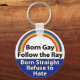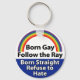 GAY PRIDE KEYCHAIN DESIGNED BY DEVIN MICHAEL CONTAINING PHRASE BORN GAYN FOLLOW THE RAY BORN STRAIGHT REFUSE TO HATE AND PRIDE RAINBOW IMAGE.