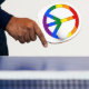 Promote peace and pride at the same time with this fun gay pride rainbow flag peace sign symbol ping pong paddle with white background and red rubber rear.