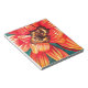 From a vibrant watercolour painting of a macro close up Gazania orange and yellow flower. Painted by watercolour artist Sacha Grossel, this native South African fine art desert flower is bright and stunning against a dark green background.