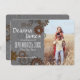 Industrial inspired steel grey save the date photo invitation with rustic tone gears.