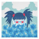 Geek girl poster with a vector illustration in blue in pink. It depicts the face of a girl with blue hair, ponytails and heart shaped eyeglasses half hidden behind many blue flowers.
