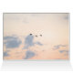 Three geese fly through a soft orange sky peppered with blue clouds.