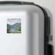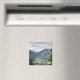 Square souvenir photo magnet of the famous fjord Geirangerfjord, a cruise ship and the village of Geiranger between the mountains in Norway.