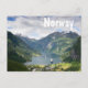 Postcard with the famous fjord Geirangerfjord, a cruise ship and the village of Geiranger between the mountains in Norway with the text: 'Norway'.