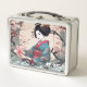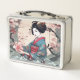 Geisha embracing cherry blossoms on a metal lunchbox.