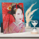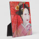with original art design from watercolour painting by Sacha Grossel of Japanese Geisha with pink kimono and bright red umbrella. This beautiful design is inspired by Asian and oriental style art and has intricate details in the kimono pattern with pink and turquoise flower patterns.