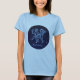Tee featuring the zodiac symbol for Gemini in soft silver blue, as a round medallion, overlaid with the stars of the constellation, against a starry sky background graded from deep midnight blue to black.