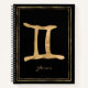 Stylised hammered gold Gemini the Twins astrology zodiac birthday symbol in a hand drawn gold double line frame. A hardcover or softcover notebook with your choice of inside pages. Choose from sketchbook, bullet journal, checklist, graph paper, recipe book, or lines in various widths and colours. Customisable. Aquarius text in a fine script on the front cover can be personalised, text can also be added on the back.