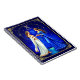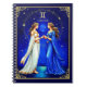 Notebook in two ethereal women representing the zodiac sign Gemini. Dressed in elegant white and blue gowns, they stand mirrored, holding hands beneath a starry night sky. The Gemini symbol appears above them evoking celestial harmony and duality.