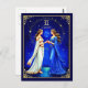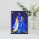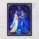 Postcard in two ethereal women representing the zodiac sign Gemini. Dressed in elegant white and blue gowns, they stand mirrored, holding hands beneath a starry night sky. The Gemini symbol appears above them evoking celestial harmony and duality.
