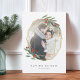 Elegant geometric holiday cards feature your favourite photo set inside a gemstone inspired frame in faux gold foil, accented with green watercolor leaves and red berries. Personalise with your names and a short custom holiday greeting (shown with "happiest holidays") and add two additional photos to the back, along with the year.