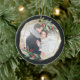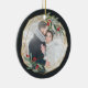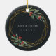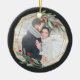 Elegant photo Christmas ornament features a favorite photo encircled by a faux gold foil geometric frame with green watercolor foliage and red berries. Add your names and the year, or a custom message, to the reverse side in a matching frame.