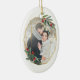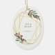 Elegant photo Christmas ornament features a favourite photo encircled by a faux gold foil oval geometric frame with green watercolor foliage and red berries. Add your names and the year, or a custom message, to the reverse side in a matching delicate geometric frame.
