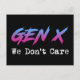 Gen X - We Don't Care. This funny retro Gen X accessory is a great gift for a Generation X woman, man, husband, wife, boyfriend, girlfriend, father, mother, dad or mum who grew up in the 1970s, 1980s or 1990s. This vintage design is perfect for Gen Xers who remember the 80s and 90s, and who have nostalgia for icons, movies, music, bands, and tv shows from the eighties and nineties era.