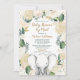 This gender neutral baby shower by mail invitation features a watercolor elephant illustration, white rose flowers, greenery wreath and faux gold confetti. Easily personalise using the online template fields. This invite design also works for a baby girl or baby boy. NOT ACTUAL GOLD FOIL