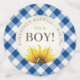 Announce the gender of your baby with custom confetti for a fun and unexpected touch! Designed to match my baby q shower set, this confetti features a blue gingham print design with a painted sunflower in a variety of messages including, its a boy, your names and baby shower date. To see more gender reveal party ideas visit www.zazzle.com/vginvites