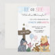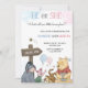 Invitation card for a gender reveal with Winnie the Pooh, Piglet, Eeyore, and Tigger. It features pastel colors, balloons, and playful, joyful imagery.