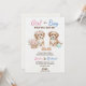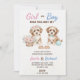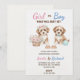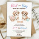 Gender reveal invitation featuring two puppies, one with a pink bow and flowers, the other with a blue ball and bow tie. Text reads "Girl or Boy, What Will Baby Be?" with event details for a party hosted by Arietta and Richard on September 20.