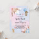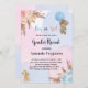For a modern boho style baby shower, gender reveal party. A blue, pink, white watercolored background. Decorated with rose gold, pink and light blue florals, roses, pampas grass and a two teddy bears holding balloons. Personalise and add a name and party details.