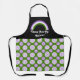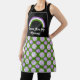 Medium-sized apron with an image of a genderqueer pride flag and a rainbow, and repeating seamless flower pattern; green, white, and purple design on a black background, with a customisable text template for your own name or message