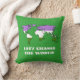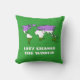 Customisable throw pillow with the map of the world in the colour of the genderqueer pride flag, a design on a green background; the text 'Let's Change the World' is a template text and can be changed.