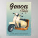 Genoa Italy For a vacation vintage poster - Scooter leaving a travelling suitcase holiday poster. "For a vacation" - Per una vacanza.