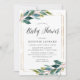Stylish and elegant baby shower invitation featuring watercolor leaves and branches in vibrant shades of dark green and teal. A stunning faux gold foil frame surrounds your baby shower details for a look that is perfect for spring and summer baby showers.