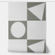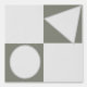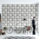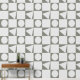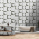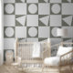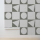 This geometric wallpaper features a repeating pattern of circles and triangles in various colours on a white background. It's a great way to add a modern and playful touch to any room.