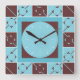 Quirky, funky retro fun clock featuring geometric grid pattern plaid in clean modern lines of alternating squares of cool chocolate brown and whimsical sky blue, accented with coordinating circles.. A trendy, chic and stylish addition to make your home, dorm or office bright and cheery.