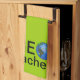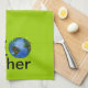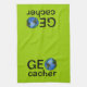 This geocaching design kitchen tea or dish towel says GEOcacher. The O is an image of an earth with flags on it, like flags where you're looking for caches.