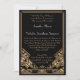 A bold, sophisticated and elegant wedding invitation with a roaring twenties "Great Gatsby" vintage theme in black and mock gold tones. A jet black background highlights the fancy, geometric Art Deco style border in shades of golden beige. Ornamental period style fonts have been selected for your special event wording. The Bride and Groom's names are emphasized by using a contrasting silver grey tone. Select your desired paper type from the extensive range available to complete the effect.