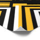The design is an abstract geometric composition made up of sharp, intersecting lines and shapes in yellow, black, and white. It features chevron-like patterns, triangles, and diagonal stripes arranged in a symmetrical yet dynamic layout. Some sections contain evenly spaced dots, while others have parallel lines of varying thicknesses. The overall effect creates a sense of depth, movement, and precision, with the contrasting colours enhancing the bold, modern appearance.