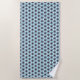 Intricate geometric patterns repeat in a symmetrical formation using blue, black, and white tones. The design focuses on circular motifs arranged to create a visually engaging and balanced effect.