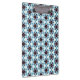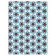 Intricate geometric patterns repeat in a symmetrical formation using blue, black, and white tones. The design focuses on circular motifs arranged to create a visually engaging and balanced effect.