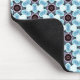 Intricate geometric patterns repeat in a symmetrical formation using blue, black, and white tones. The design focuses on circular motifs arranged to create a visually engaging and balanced effect.